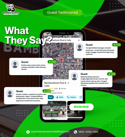 Pelanggan memilih kami karena kami menawarkan meja biliar terbaik di Medan, kafe dengan menu lezat, dan fasilitas canggih termasuk sistem rekam permainan otomatis. Komitmen kami pada kenyamanan dan pelayanan terbaik memastikan setiap kunjungan Anda berkesan.